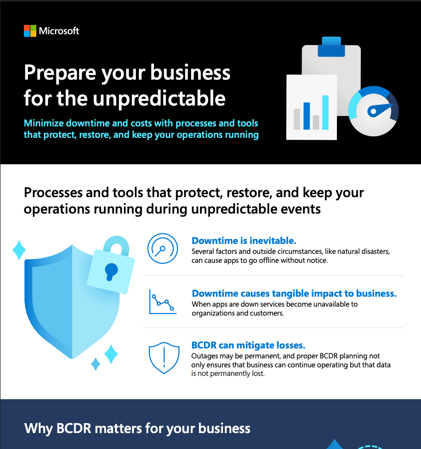 Anything can happen, and minimizing small- and large-scale disasters has become a business imperative.   A business continuity and disaster recovery (BCDR) strategy can help future-proof your business. BCDR plans ensure that if some unforeseen disaster does strike, your business can quickly navigate it with minimal operational or financial losses.   Check out this infographic to read more about BCDR and message us to find out how we can help. 🤝 #Azure