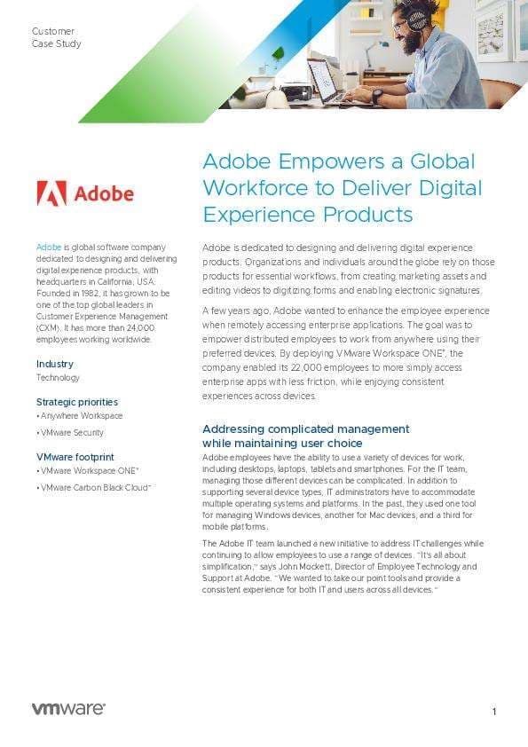 Adobe buscaba mejorar la experiencia de los empleados al acceder de forma remota a sus aplicaciones empresariales. Lea la historia del cliente para saber cómo VMware Workspace ONE ayudó a más de 22.000 empleados a obtener un acceso más fácil a las aplicaciones de la empresa con menos fricciones, a la vez que disfrutaban de experiencias coherentes en todos los dispositivos.